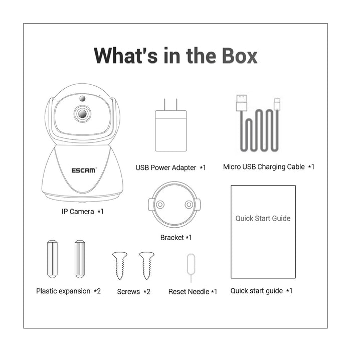 Podrobný seznam specifikací produktu je k dispozici v původním textu výše. Balíček ESCAM PT201 bude obsahovat následující položky: kamera, napájecí adaptér, sada šroubů, manuál, datový kabel, resetovací kolík a držák. Vyberte si z různých balíčků úložiště YIloT App Cloud Storage, včetně 7denního záznamu alarmu ve smyčce, záznamu alarmu s 30denním cyklem nebo nepřerušovaného záznamu 7denní smyčky.