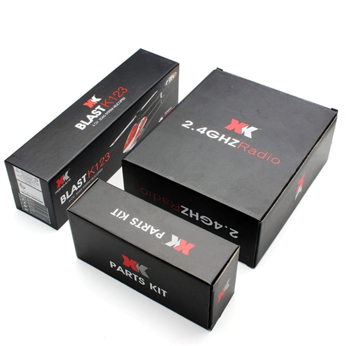 Standing at a height of 77mm and stretching across 238mm, the XK K123 sports a rotor diameter of 244mm and a flying weight of 79.5g. You'll be fascinated by the unique 3-rotor blade flybarless design, unseen in any other market offering. Thanks to its aerodynamic blades, the helicopter supplies both powerful propulsion and impressive self-stability during your flight endeavors.