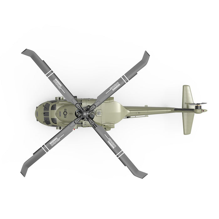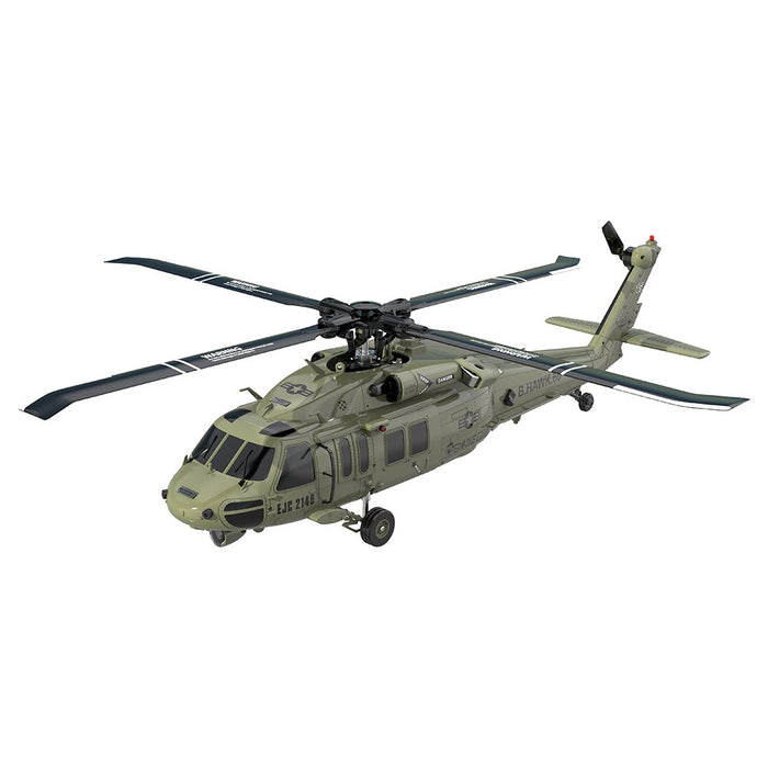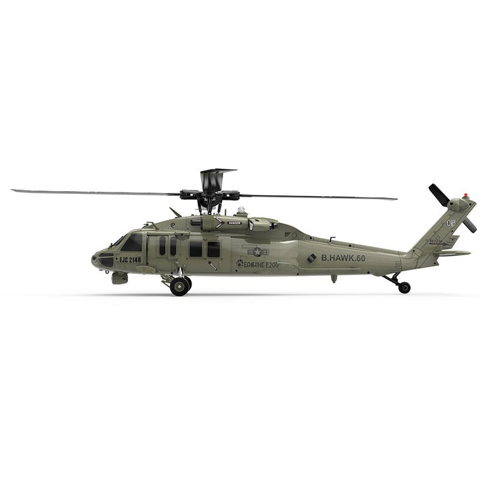 Diseñado por expertos basándose en la reducción a escala 47:1 del helicóptero estadounidense UH60-Blackhawks, el E200 cuenta con detalles de apariencia de alta simulación, luces geniales y puertas laterales móviles izquierda y derecha. Su tren de aterrizaje con amortiguación garantiza aterrizajes suaves, incluso para pilotos novatos.