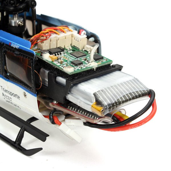 A 6 csatornás távirányító széles, 150 méteres vezérlési távolságot biztosít, és számos fejlett funkciót tartalmaz, mint például a 3D speciális IDLE kapcsoló, a gázkar tartása TH.HOLD kapcsoló, a nagy képernyős LCD és az alacsony feszültségű riasztó funkció. Ezen túlmenően a lebegési pont beállítás lehetővé teszi helikoptere repülési dinamikájának testreszabását az Ön preferenciái szerint.