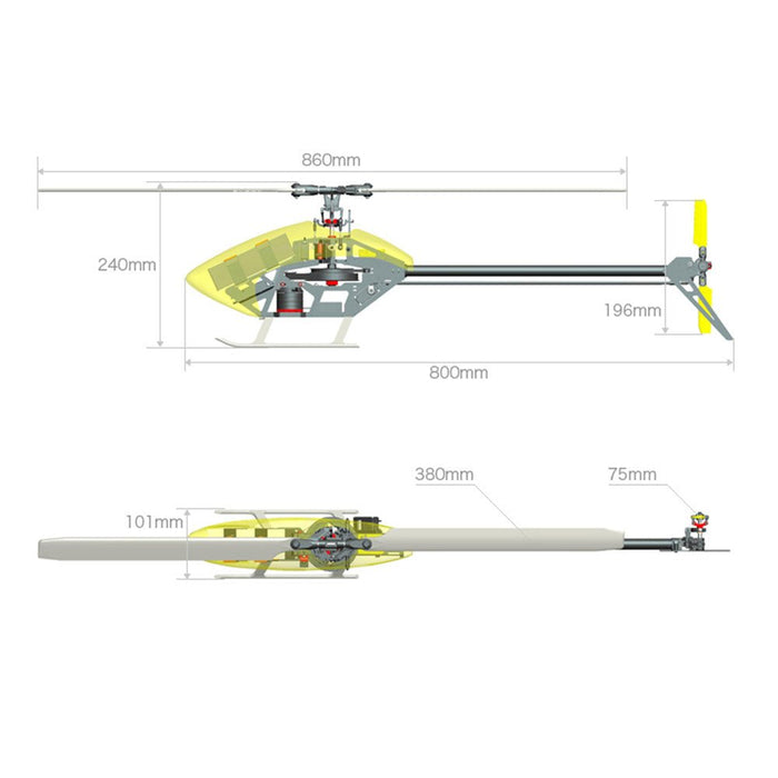 Wyposażony w średnicę głównego wirnika 860 mm i długość głównego ostrza 380 mm, X380 zapewnia wyjątkową stabilność i kontrolę na wszystkich etapach lotu. Wał główny ma średnicę 6 mm, a średnica wału wrzeciona wynosi 5 mm, zapewniając solidne podparcie wirujących wirników. Ponadto średnica wirnika ogonowego wynosząca 3196 mm zwiększa niezwykłą równowagę i precyzję helikoptera podczas lotu.