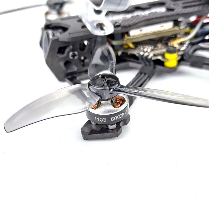 Bezszczotkowy silnik 1103 8000KV waży tylko 3,7 g. Pomimo niewielkich rozmiarów zapewnia imponującą moc i ciąg, pozwalający na lot do 5 minut. Uwaga: silnik obsługuje tylko akumulatory 2S. Podłączenie go do akumulatorów 3S i zbyt mocne dociśnięcie gazu może spowodować trwałe uszkodzenie.