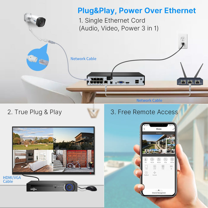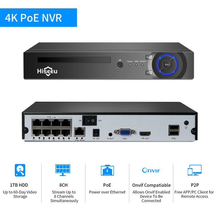 System kamer NVR Hiseeu 8CH 5MP - 4 szt. Kamery bezpieczeństwa IP POE H.265+, dźwięk, noktowizor 10 m, wodoodporność IP66, Onvif - idealny do bezpieczeństwa w domu i firmie